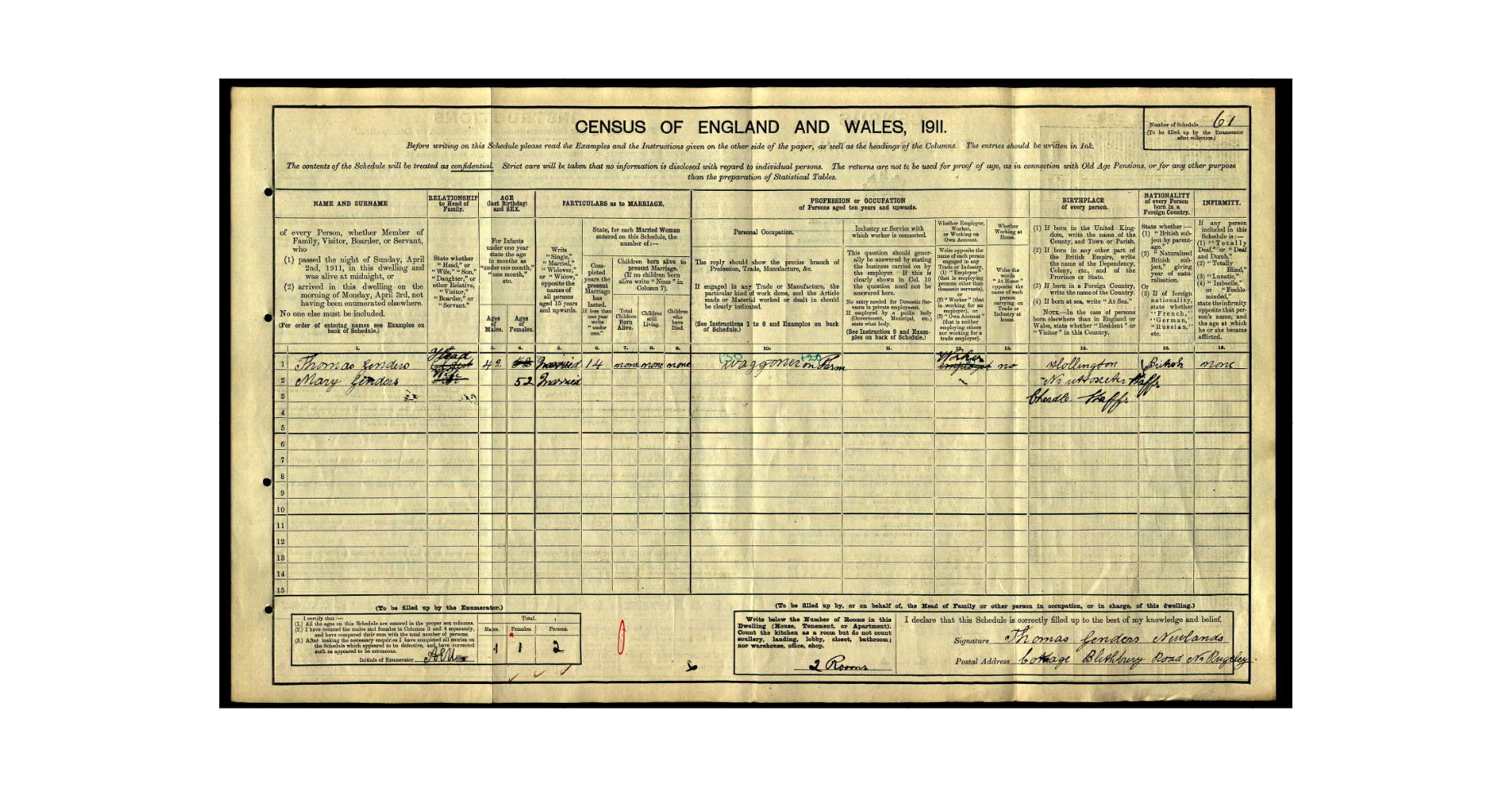 | 1 | Thomas Genders | Head | 1869 | 42 | Male | Married | Waggoner | Hollington Nr Uttoxeter, Staffordshire | Newlands, Cottage, Blithbury Road, Colton, Nr Rugeley |